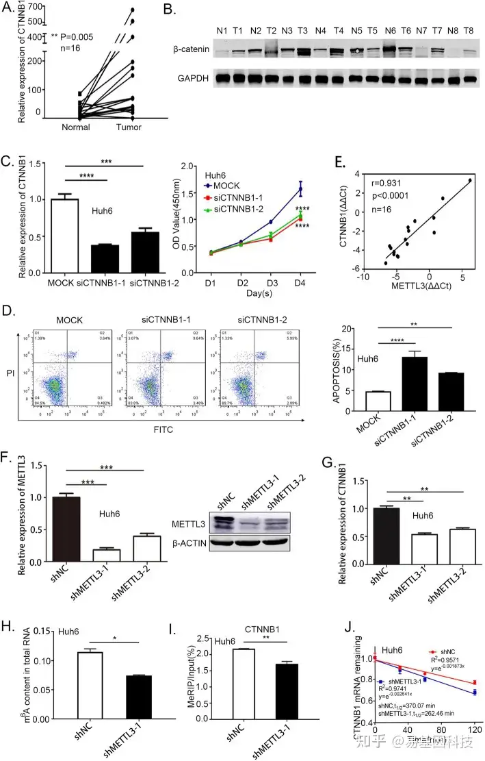 CTNNB1是Wnt/β-catenin信号通路的关键组成部分,几乎50 - 90%的HB都存在CTNNB1突变。研究人员首先证实了CTNNB1在HB肿瘤组织中的上调,敲低CTNNB1会显著降低HB细胞的活性并诱导细胞凋亡。此外还发现CTNNB1与METTL3的表达水平显著正相关。通过敲除METTL3细胞来评估CTNNB1表达的稳定性。结果表明,降低m6A甲基化可以降低CTNNB1的稳定性。综上所述,CTNNB1可能是HB中METTL3的下游靶点。