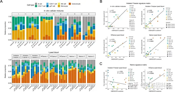 B~C. 散点图比较流式细胞术与CIBERSORTx值,其中仅使用Holstein Friesian(B)或Nelore(C)参考样品预测混合物组成。通过Spearman秩相关(rs)和线性回归(实线)鉴定一致性。gdT细胞表示γδT细胞