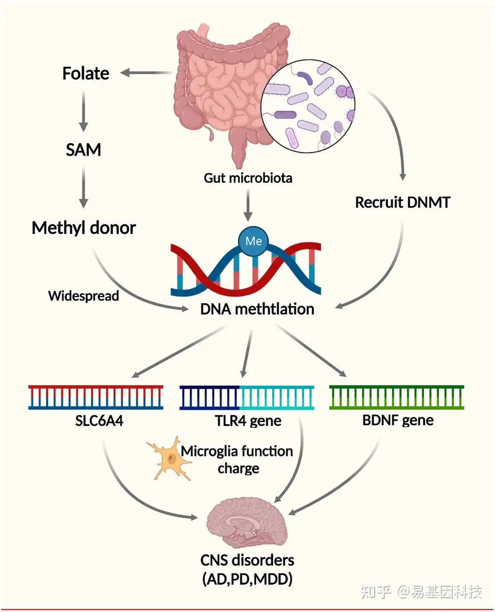 在包括AD和精神分裂症在内的神经精神疾病中观察到DNA甲基化水平的变化。因此有理由推测甲基化水平变化可能与肠道菌群有关,但仍需要进一步研究。