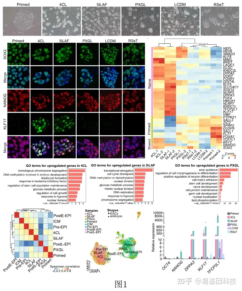图1. 在指定条件下培养的ESCs的免疫荧光图像以及原始多能性基因的表达水平和相关性特征。