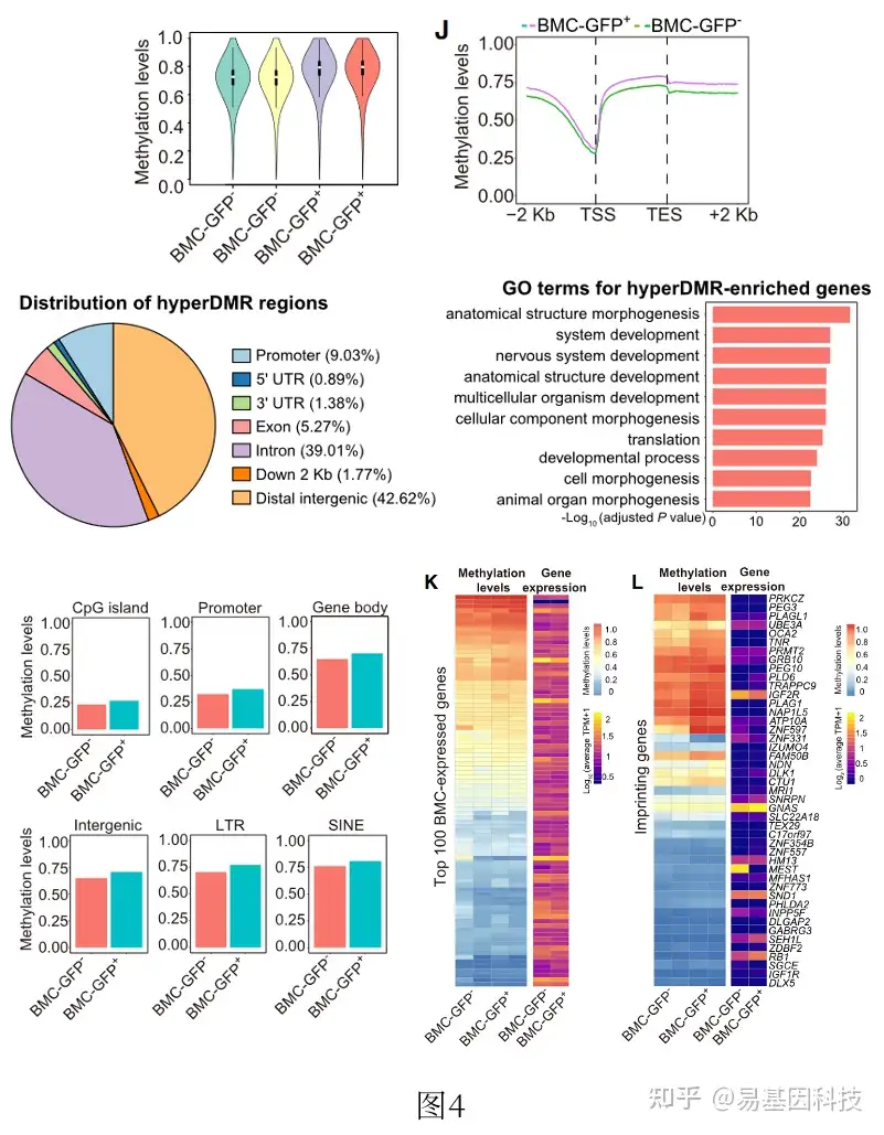 图4. GFP+BMC和GFP-BMC整体、TSS,TES,不同基因组区域的DNA甲基化水平以及GFP+BMC在整个注释基因组中高甲基化区域分布,启动子区域DNA甲基化水平与BMC表达基因与印记基因的表达水平聚类热图