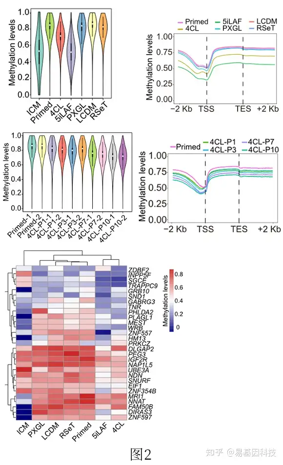 由于DNA去甲基化是一种表观遗传学机制,通过这种机制,原始ESC可转化为幼稚多能状态,因此研究进行了微量DNA全基因组亚硫酸氢盐测序(Micro-WGBS)。结果表明,在RSeT、PXGL和LCDM中培养的ESCs的DNA甲基化水平较高(83%-86%),与原始ESCs的水平相似;4CLESCs的水平较低(72%),而5iLAFESCs的水平最低(52%),4CL和5iLAFESCs显示的印记基因DNA甲基化模式与ICM更为接近(图2)。