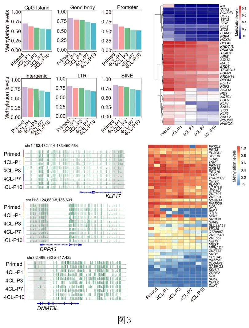 此研究还在4CL原始转化的不同阶段进行了全基因组甲基化分析,发现包括原始多能基因位点(KLF17、DPPA3和DNMT3L3)在内的所有基因组元件都出现了渐进的DNA去甲基化现象。另外,在4CL原始转换的不同时期进行了甲基化测序,发现包括原始多能基因位点(KLF17、DPPA3和DNMT3L3)在内的所有基因组元件都出现了逐渐的DNA去甲基化过程。此外,在转化过程中,一些印记基因的启动子区域也检测到了动态去甲基化(图3)。