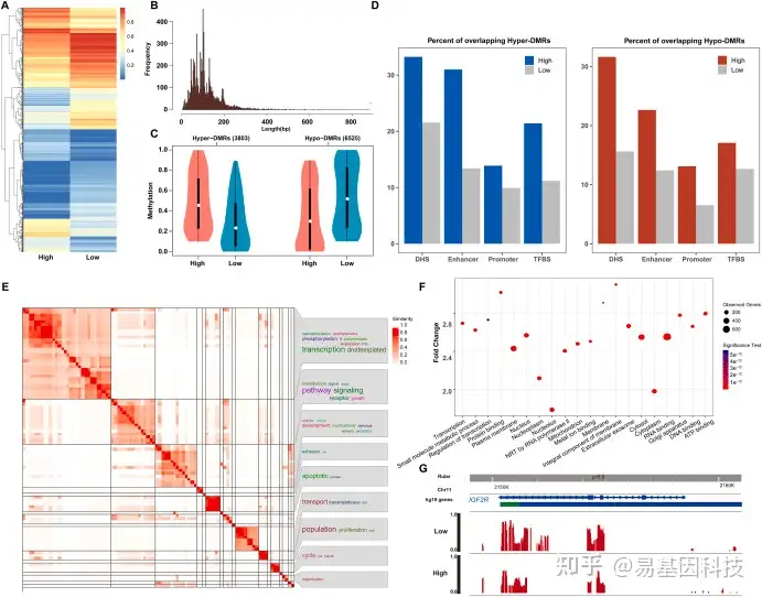 使用RRBS进行的全基因组DNA甲基化分析鉴定出两组的10328个DMRs(图5A)。DMRs的中位长度为102 bp(图5B)。在DNA甲基化的方向和水平上,与PM2.5低暴露相比,PM2.5高暴露导致高甲基化(3,803)和低甲基化(6,525)DMRs(图5C)。为了分析高PM2.5诱导的精子DMRs生物学过程,研究人员将转录起始位点上游1500 bp和下游500 bp范围内的DMRs进行功能富集分析。筛选出Q值(多重校正p值)< 0.05的通路,共390条。随后分析了与空气污染相关的DMRs是否与注释的基因组特征重叠。根据人类DNA ENCODE数据,与空气污染相关的DMRs与顺式调节区域(DHSs、增强子和TFBS)显著重叠(图5D),且与增强子重叠的DMR多于启动子。综上所述,空气污染相关的DNA甲基化变化主要发生在远端调控区,并可能影响基因表达。图5E给出了对应聚类标注的GO相似性热图,主要聚类为细胞生物过程、离子转运和生物调节。图5F显示了最显著Q值的前15条通路。其中最重要的功能通路是"蛋白结合(protein binding)",在该通路中观察到胰岛素样生长因子受体2 (IGF2R)基因。图5G显示相应突变体中IGF2R周围的甲基化率降低。