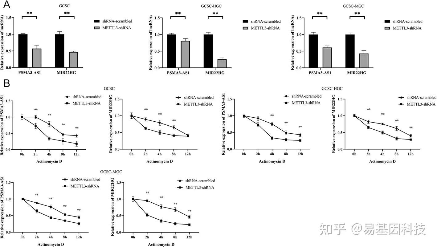 - 用放线菌素D处理METTL3沉默的GCSCs的lncRNAs稳定性。