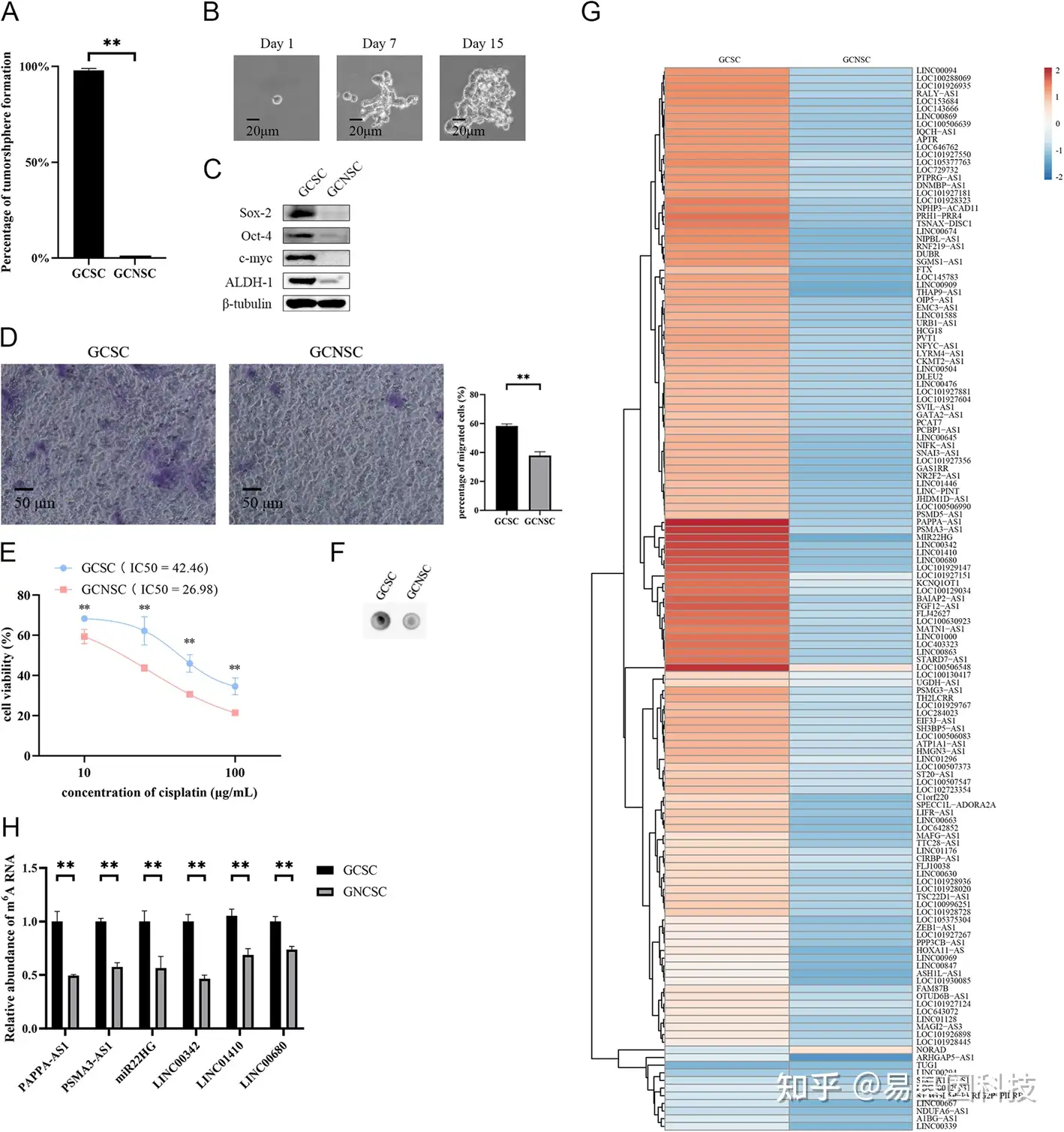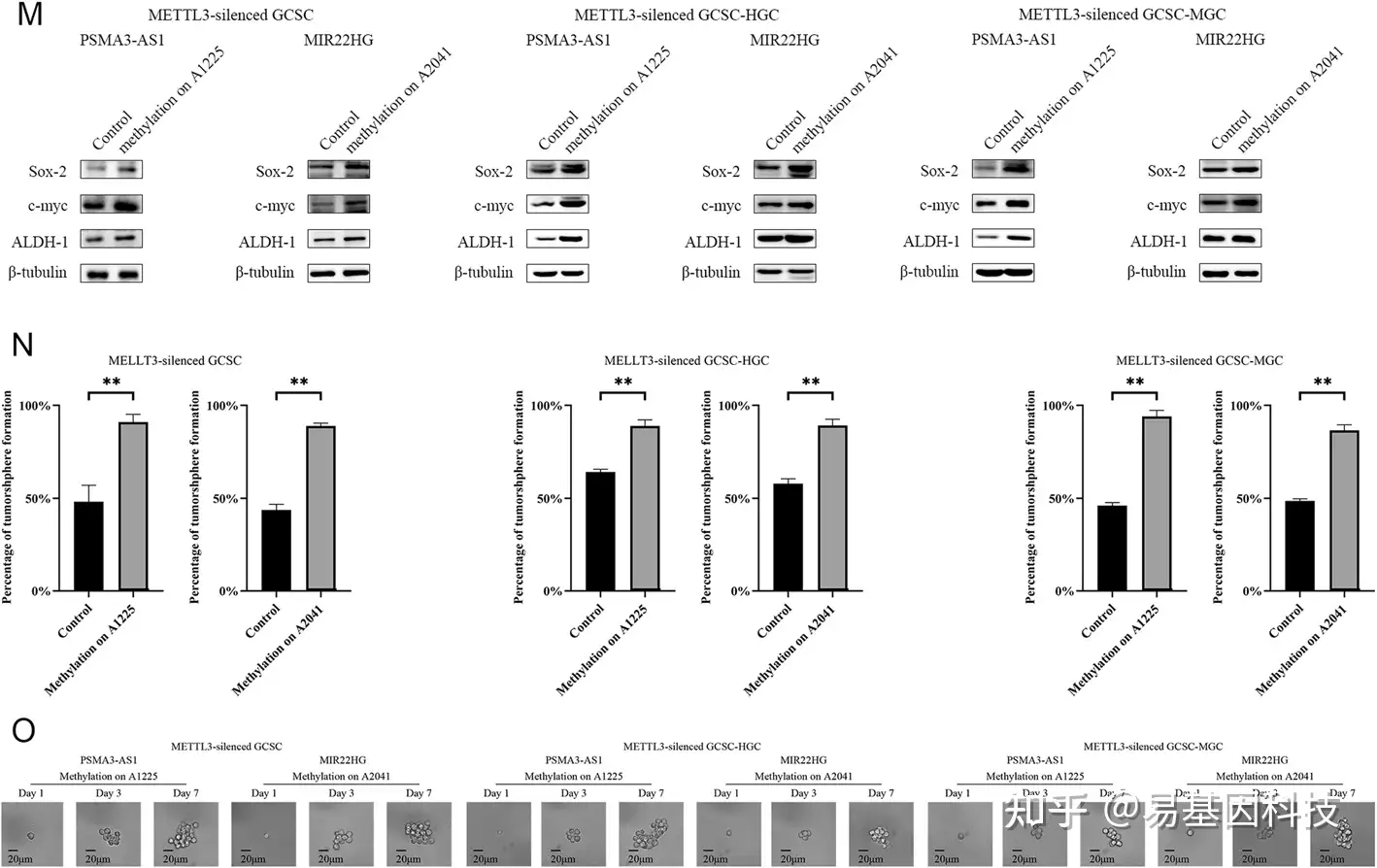 - 用甲基化的lncRNA对METTL3沉默的GCSC的单细胞进行肿瘤球形成检测。**p<0.01