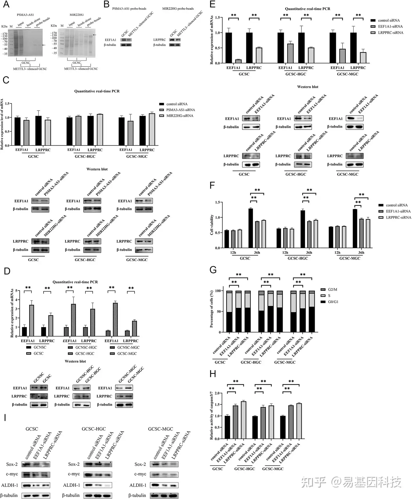 - 通过RT-qPCR和Western Blot分析验证GCSC中EEF1A1或LRPPRC的沉默。