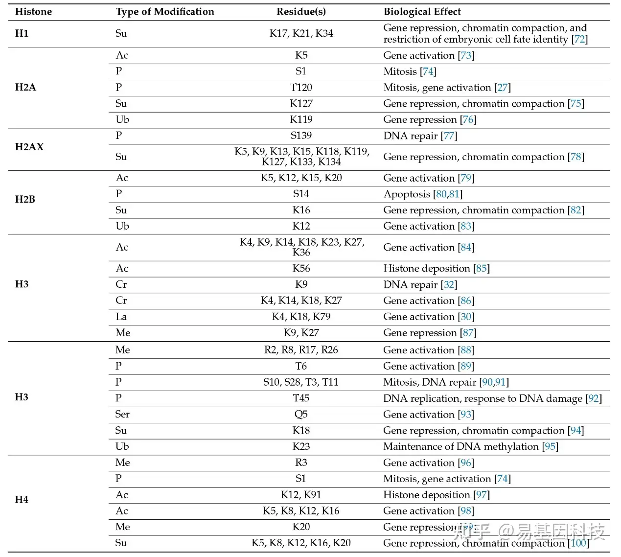 已经广泛研究了几种关键的组蛋白修饰,包括乙酰化、甲基化、磷酸化、泛素化、SUMO化、乳酸化、巴豆酰化和血清素化(表2和图1、图2)。