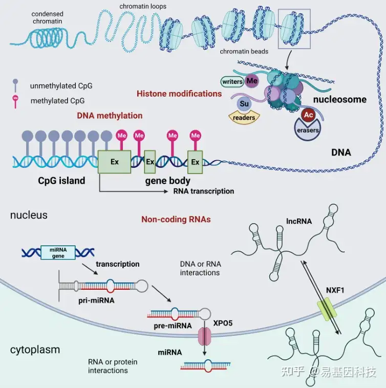 图1:哺乳动物细胞中表观遗传修饰的三组主要示意图:DNA甲基化、组蛋白修饰和非编码RNA。