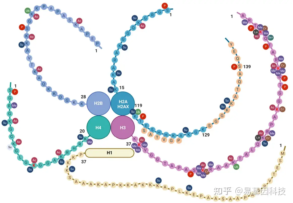 氨基酸残基用一个字母表示。缩写:Ac=乙酰化;Cr=巴豆酰化;La=乳酰化;Me=甲基化;P=磷酸化;Ser=血清酰化;Su=苏基化;Ub=泛素化。