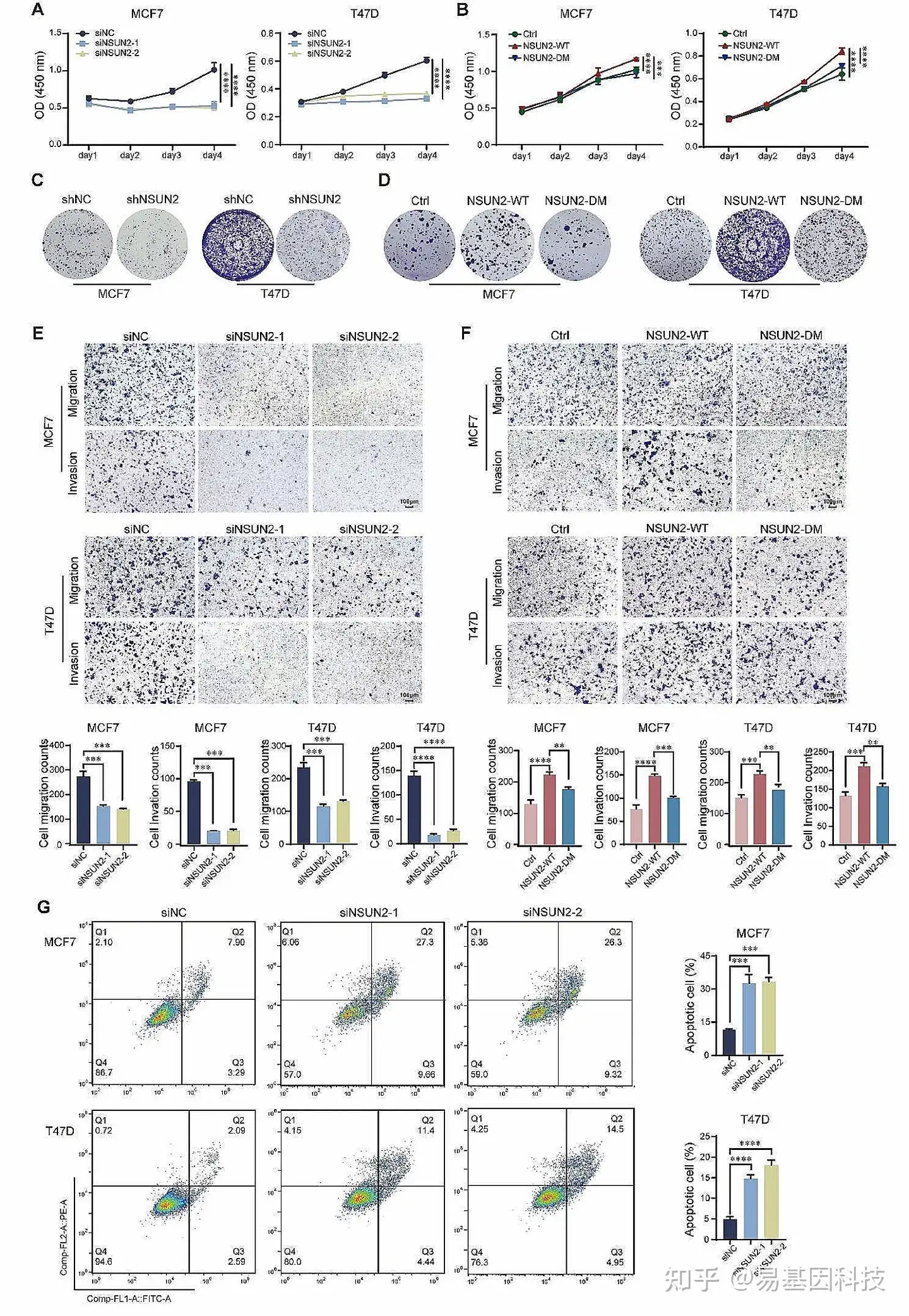 - 和 (B) 通过CCK-8实验分析敲低NSUN2(NSUN2-knockdown)、野生型NSUN2(NSUN2-WT)或双催化突变型NSUN2(NSUN2-DM)的乳腺癌细胞增殖。