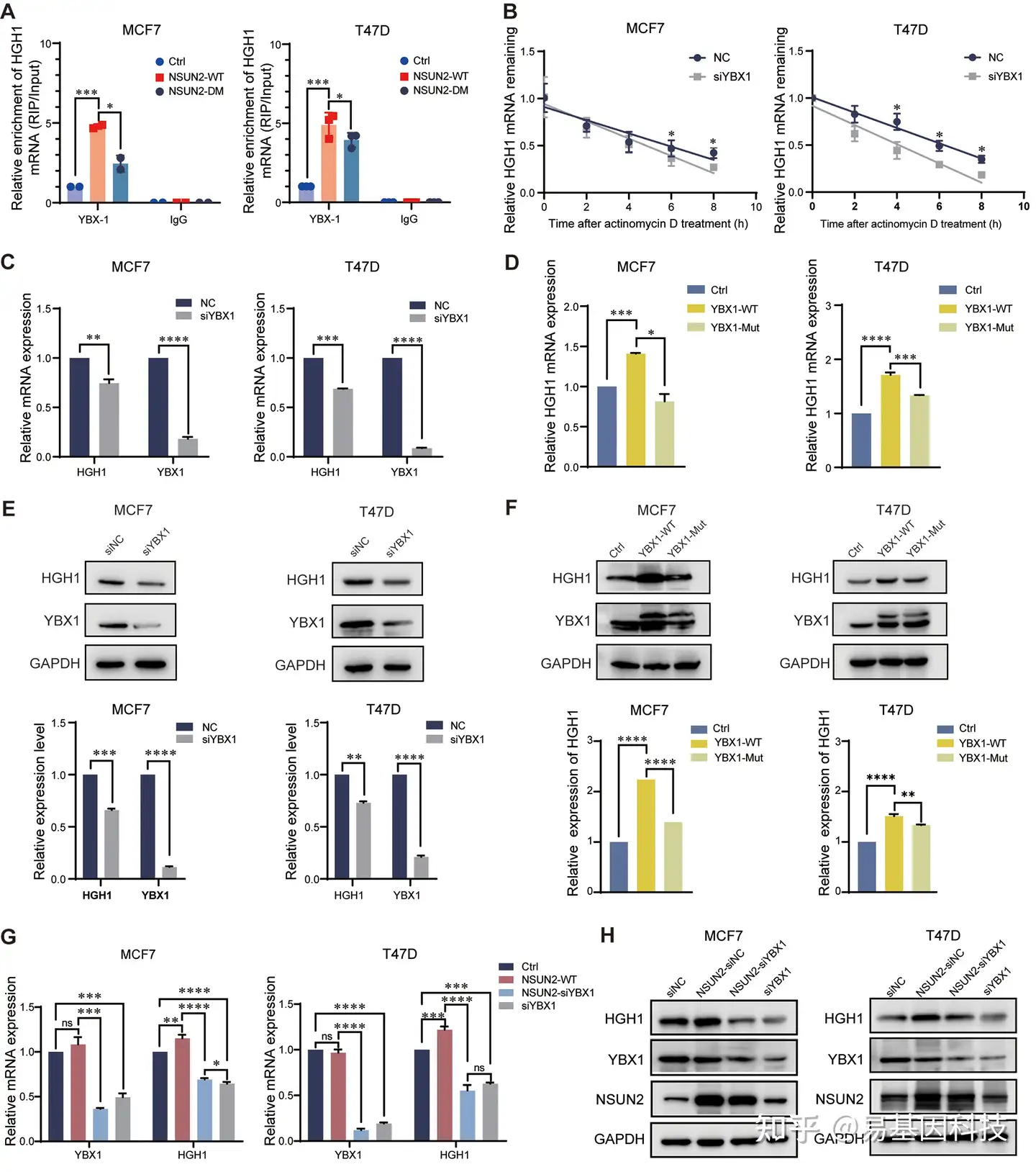 通过体内外实验阐明了NSUN2/YBX1依赖于m5C来调控HGH1 mRNA的稳定性和表达的分子机制。