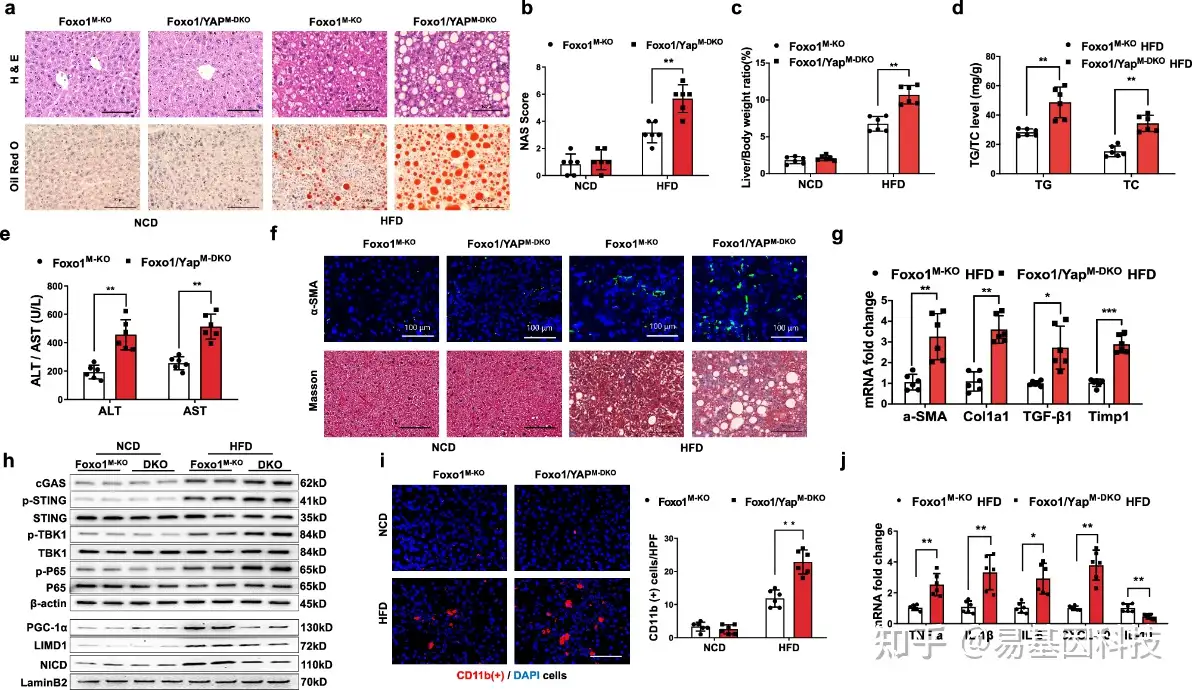 HFD诱导的NASH小鼠Foxo1/YAPM-DKO加剧了STING介导的肝脏炎症、脂肪变性和纤维化。