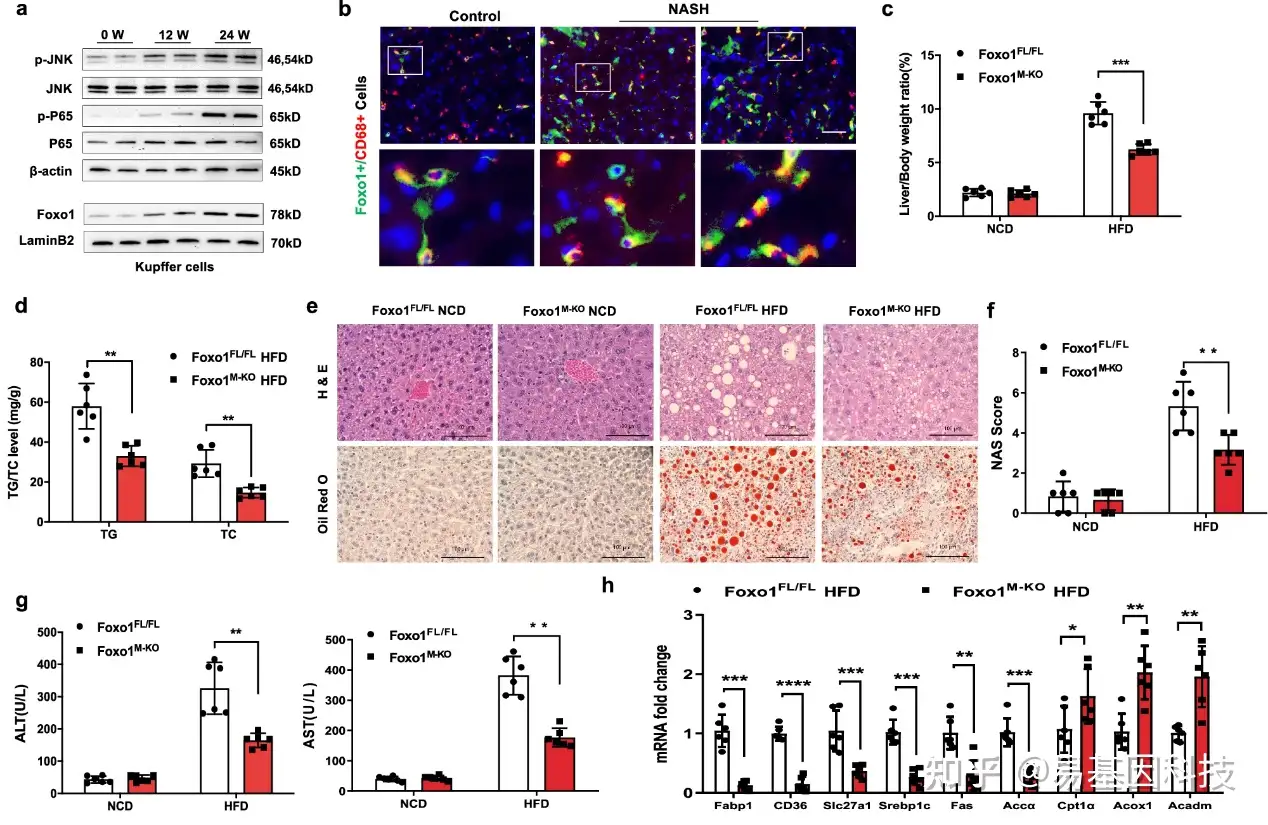 为鉴定巨噬细胞Foxo1是否参与肝脏脂肪变性,研究分析了脂肪肝中Kupffer细胞的Foxo1表达。通过Western blot、免疫荧光染色、组织学染色、定量PCR等实验研究结果表明,巨噬细胞中Foxo1缺失可以减少高脂饮食诱导的脂肪变性和炎症反应。Foxo1在调控肝脏脂肪积累和炎症过程中的作用表明巨噬细胞Foxo1在NASH的发生和发展中起着至关重要的作用,而调节Foxo1活性或表达可能为治疗NASH提供一种新策略。