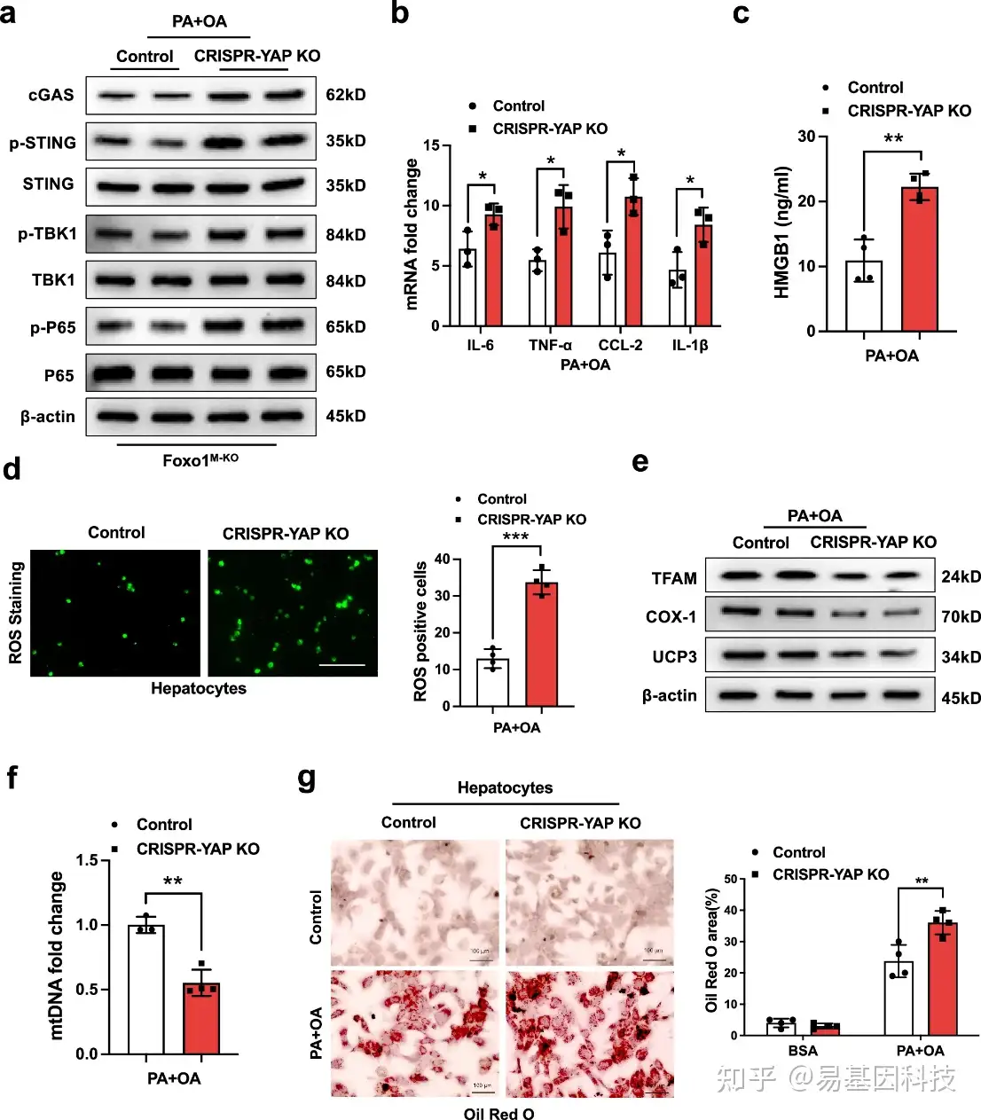 图 7:YAP是巨噬细胞Foxo1介导的STING功能免疫调节在脂毒性诱导的线粒体氧化应激中所必需的。从Foxo1M-KO小鼠中分离的骨髓源性巨噬细胞(BMMs),转染CRISPR/Cas9介导的YAP基因敲除(p-CRISPR-YAP KO)或对照载体,然后在与0.2 mM棕榈酸(PA)和0.4 mM油酸(OA)混合物孵育24小时后,与原代肝细胞共培养。