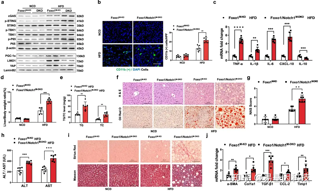 Foxo1/Notch1M-DKO激活了cGAS,增加了STING介导的炎症反应,并加剧了HFD诱导的NASH中的肝纤维化。
