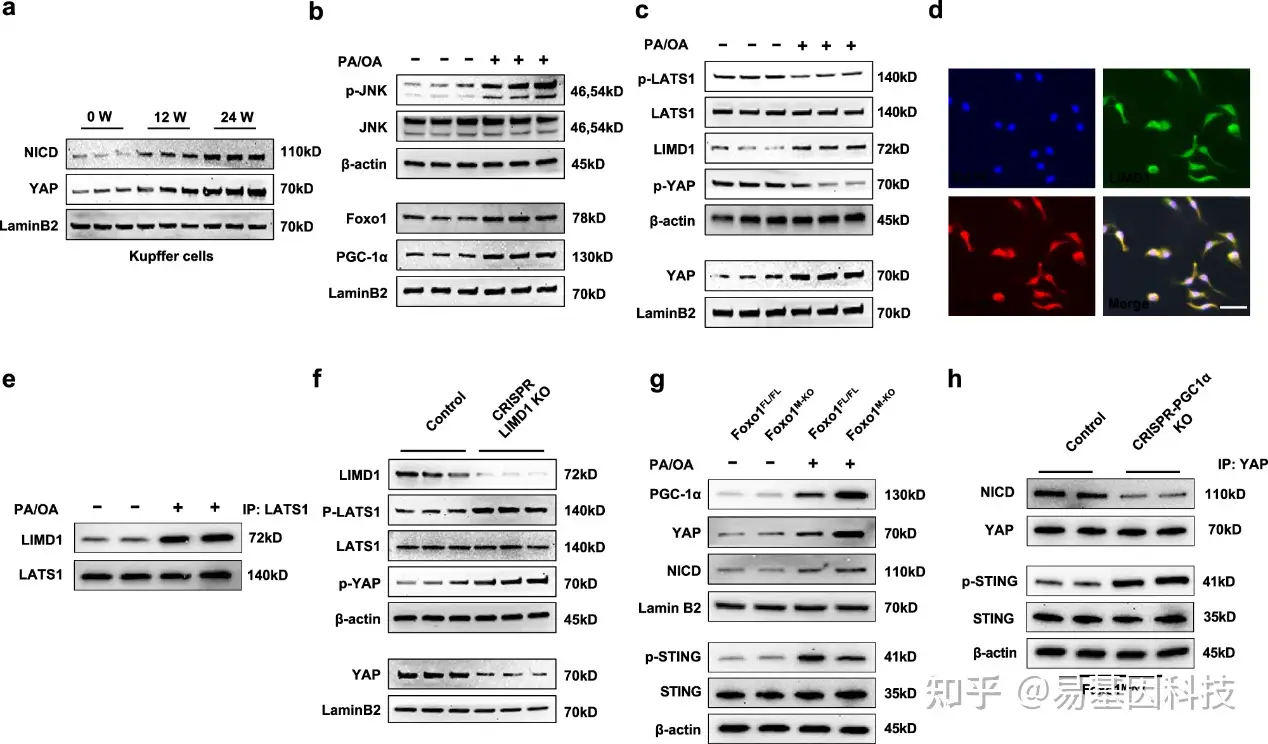 - 24周HFD喂养后,Foxo1/Notch1M-DKO增加了脂肪肝中cGAS、p-STING、p-TBK1、p-P65以及核PGC-1α、LIMD1和YAP的表达。