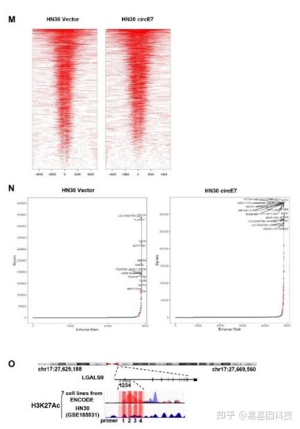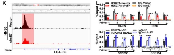 图:HN30细胞中过表达circE7的ChIP-seq和ChIP-qPCR分析