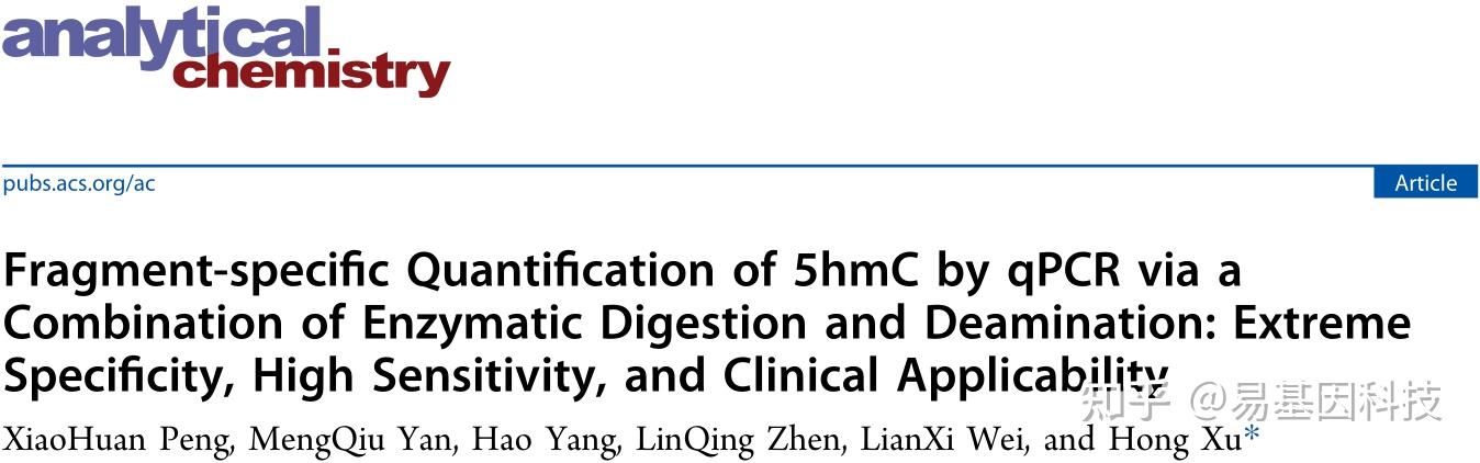 近日,上海交通大学生物医学工程学院彭小焕博士为第一作者、徐宏研究员为通讯作者在《Analytical Chemistry》期刊发表题为“Fragment-specific Quantification of 5hmC by qPCR via a Combination of Enzymatic Digestion and Deamination: Extreme Specificity, High Sensitivity, and Clinical Applicability”的科研成果,研究建立了一种名为EDD-5hmC的5hmC定量方法,该方法通过结合酶切(Enzymatic Digestion)和生物脱氨(Deamination)策略,利用qPCR平台实现对片段特异性DNA序列中5hmC的极高特异性、高灵敏度和临床适用性的定量分析。该方法首次在结直肠癌组织和配对的癌旁组织中检测了5hmC水平,以评估其区分结直肠癌的能力,结果显示单基因Septin9的ROC曲线下面积高达82.8%,Septin9和Syndecan-2(SDC2)组合的ROC曲线下面积为83.6%,表明EDD-5hmC方法是一种具有临床应用前景的准确定量5hmC水平的方法。深圳易基因科技为本研究提供靶基因DNA羟甲基化检测(AmpACE-seq)技术服务。