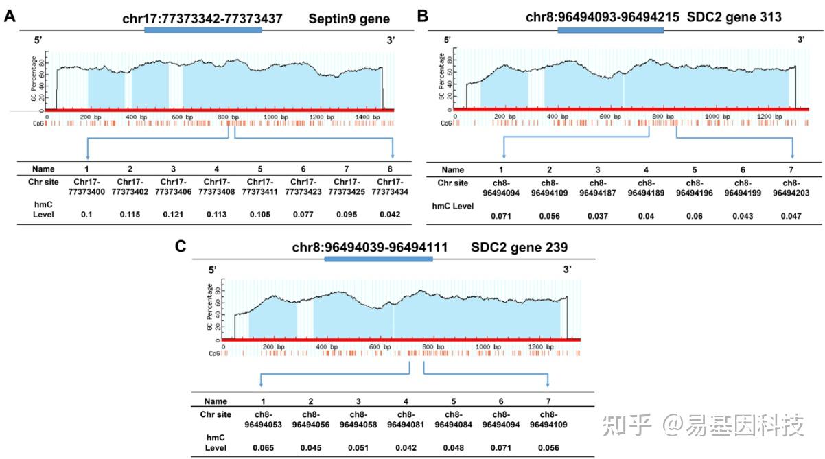 图2:EDD-5hmC检测法中使用的Septin9(A)、SDC2 313(B)和SDC2 239(C)的最终选定位点。