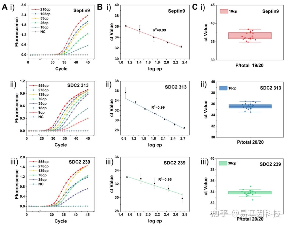 为了评估EDD-5hmC检测法的灵敏度,通过2倍系列稀释HCT116基因组DNA来评估已建立检测法的分析性能,其中羟甲基化DNA的理论input拷贝数通过AmpACE-seq获得的5hmC比例计算得出。分析结果表明,对于Septin9、SDC2 313和SDC2 239,随着羟甲基化DNA浓度降低,Ct值逐渐增加。羟甲基化拷贝数与Ct值之间的关系分别为R²=0.99、R²=0.99和R²=0.95,这突出了EDD-5hmC检测法的定量分析能力。