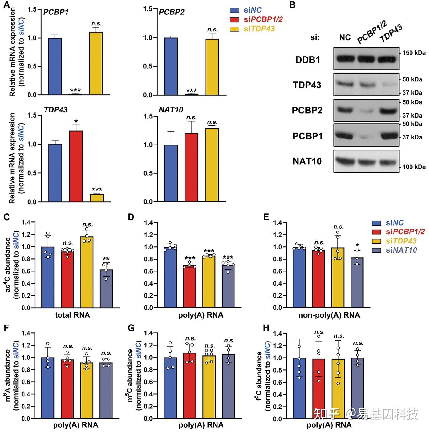 B. western blotting实验比较对照组(siNC)与PCBP1/2或TDP43敲低组之间PCBP1/2、TDP43和NAT10的蛋白表达水平。DDB1为对照。