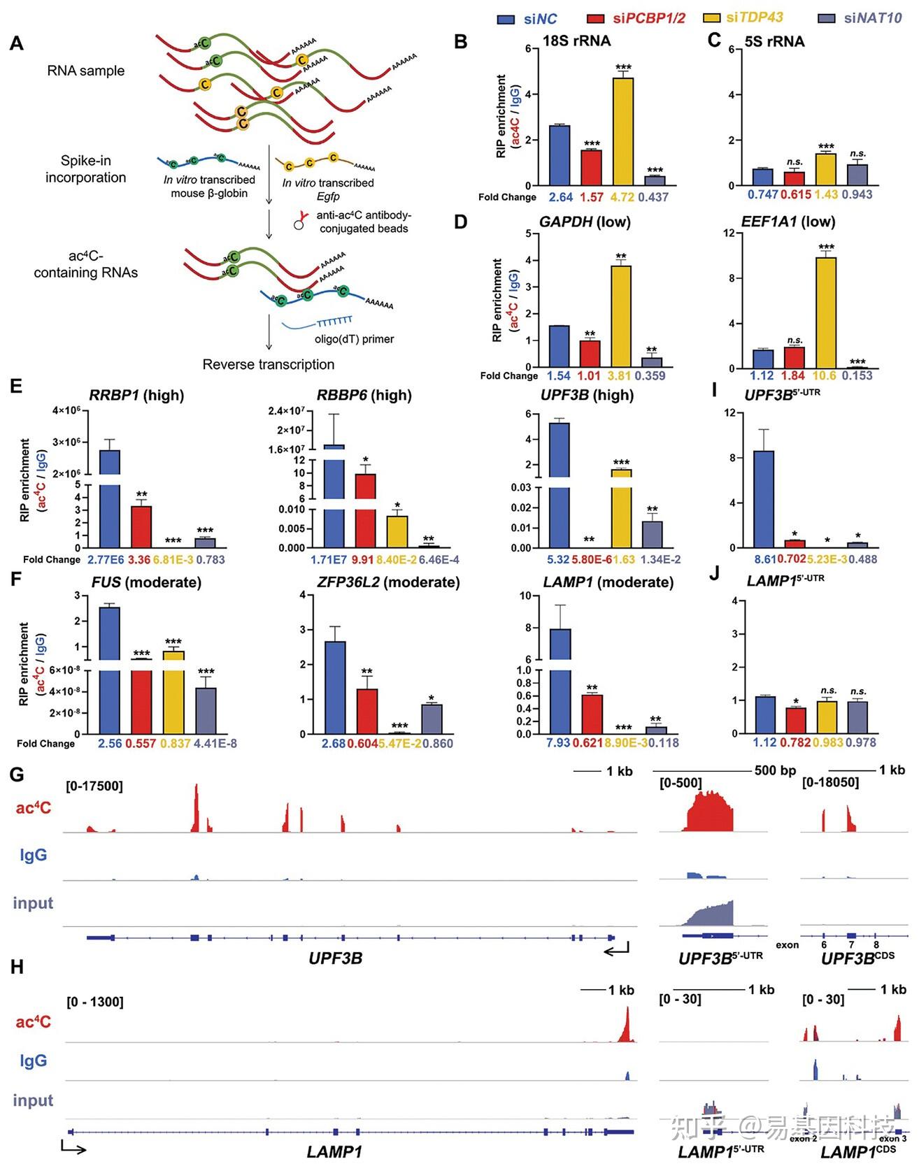 - 揭示了ac4C修饰的动态变化:acRIP-seq技术使得研究者能够观察到在不同基因敲低条件下ac4C修饰的变化,进一步揭示了NAT10/PCBP/TDP43复合体在mRNA乙酰化中的协同作用机制。