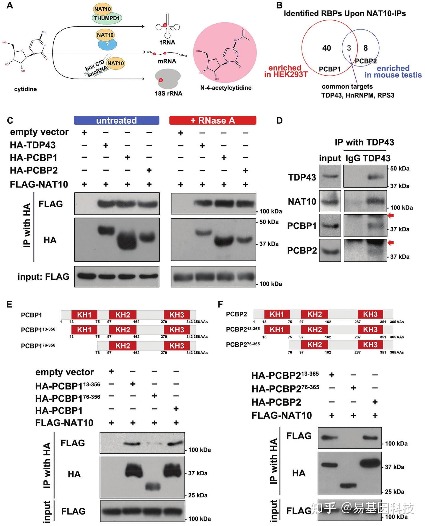 - 蛋白质互作分析:通过亲和纯化和质谱分析,鉴定出与NAT10互作的蛋白质,发现PCBP1/2和TDP43与NAT10存在互作。