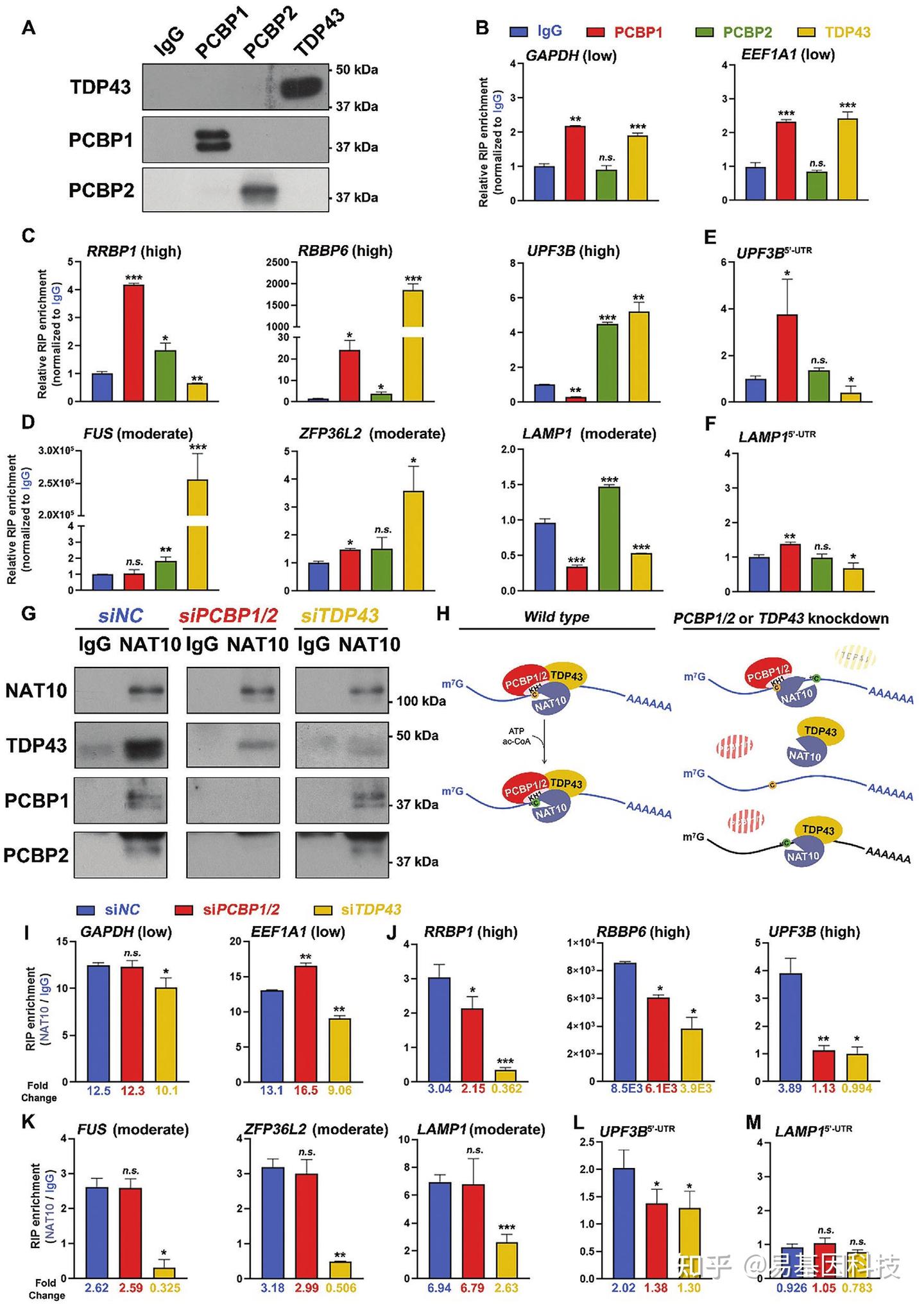 I-K. RT-qPCR结果显示在PCBP1/2和TDP43敲低后,NAT10与指示的偏好性乙酰化修饰mRNA之间的连接变化。
