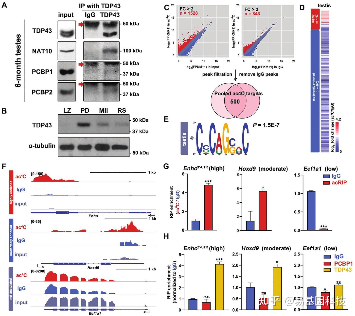 H. RT-qPCR结果显示TDP43对小鼠睾丸中偏好性ac4C靶标mRNA的亲和力。