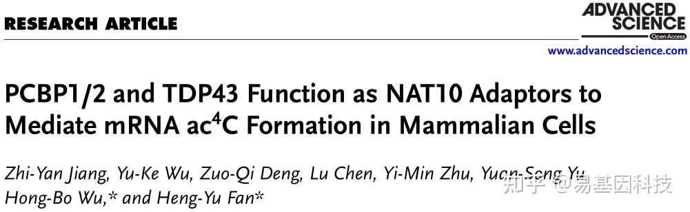 Jiang ZY, Wu YK, Deng ZQ, Chen L, Zhu YM, Yu YS, Wu HB, Fan HY. PCBP1/2 and TDP43 Function as NAT10 Adaptors to Mediate mRNA ac4C Formation in Mammalian Cells. Adv Sci (Weinh). 2024 Nov 18:e2400133. doi: 10.1002/advs.202400133.
