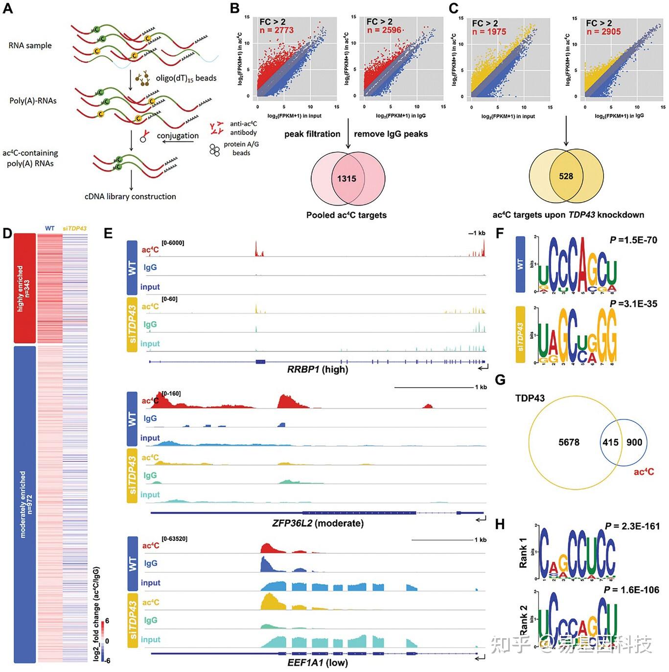 F. acRIP-seq鉴定的ac4C峰簇的富集序列motif分析。上:WT 293T mRNA中的ac4C motif(P=1.5E-70)。下:siTDP43 mRNA中的ac4C motif(P=3.1E-35)。