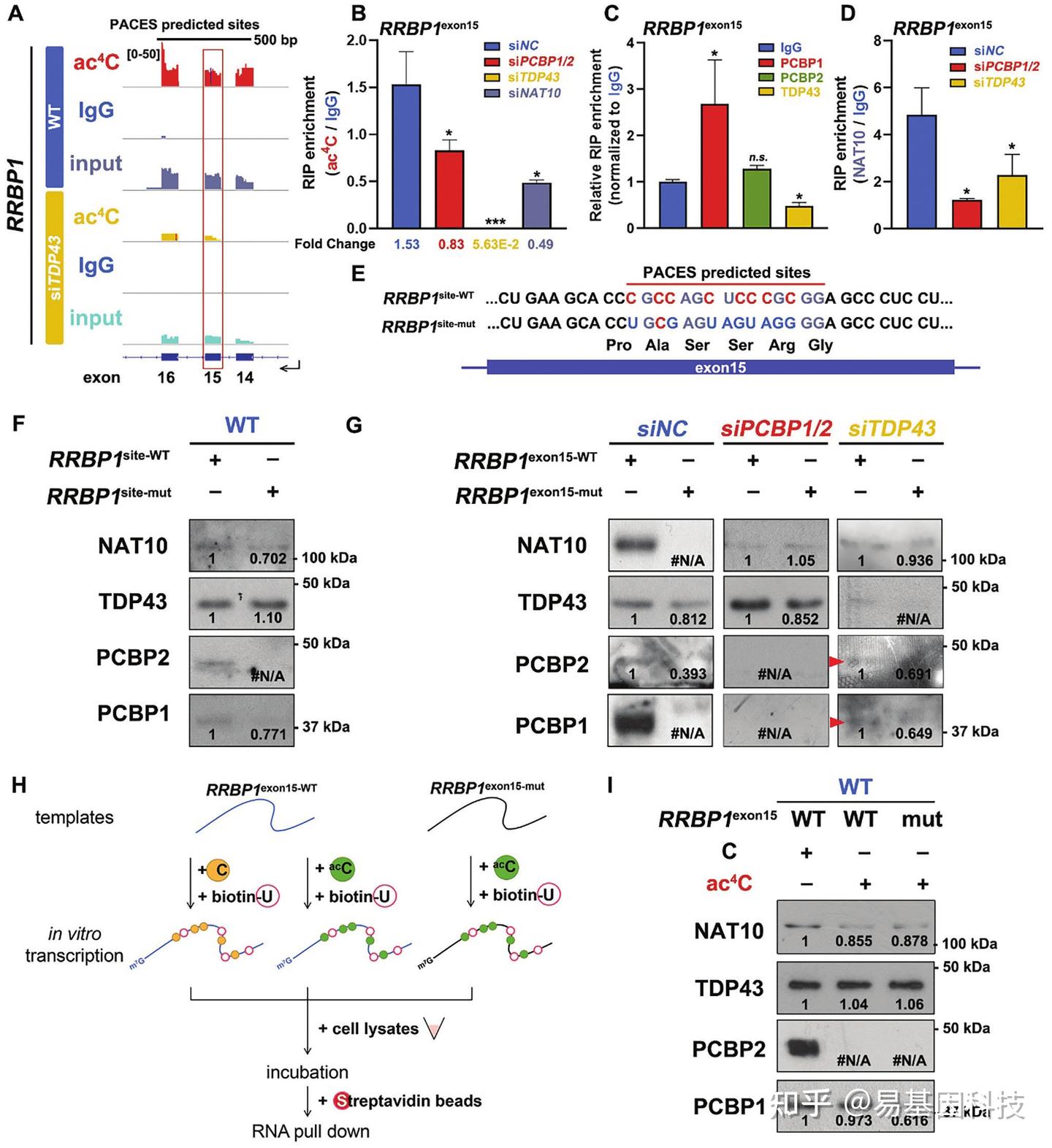 G. RNA下拉结果显示在对照组以及PCBP1/2、TDP43和NAT10敲低后,RRBP1 exon15与NAT10/PCBP/TDP43复合体亚基之间的亲和力变化。