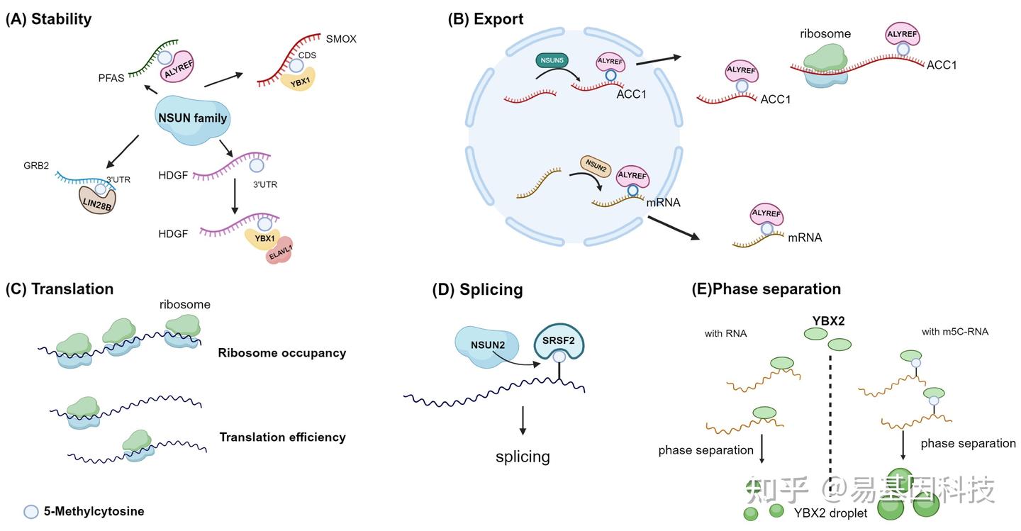 图5:不同研究中mRNA上m5C甲基化的多样化生物学功能。