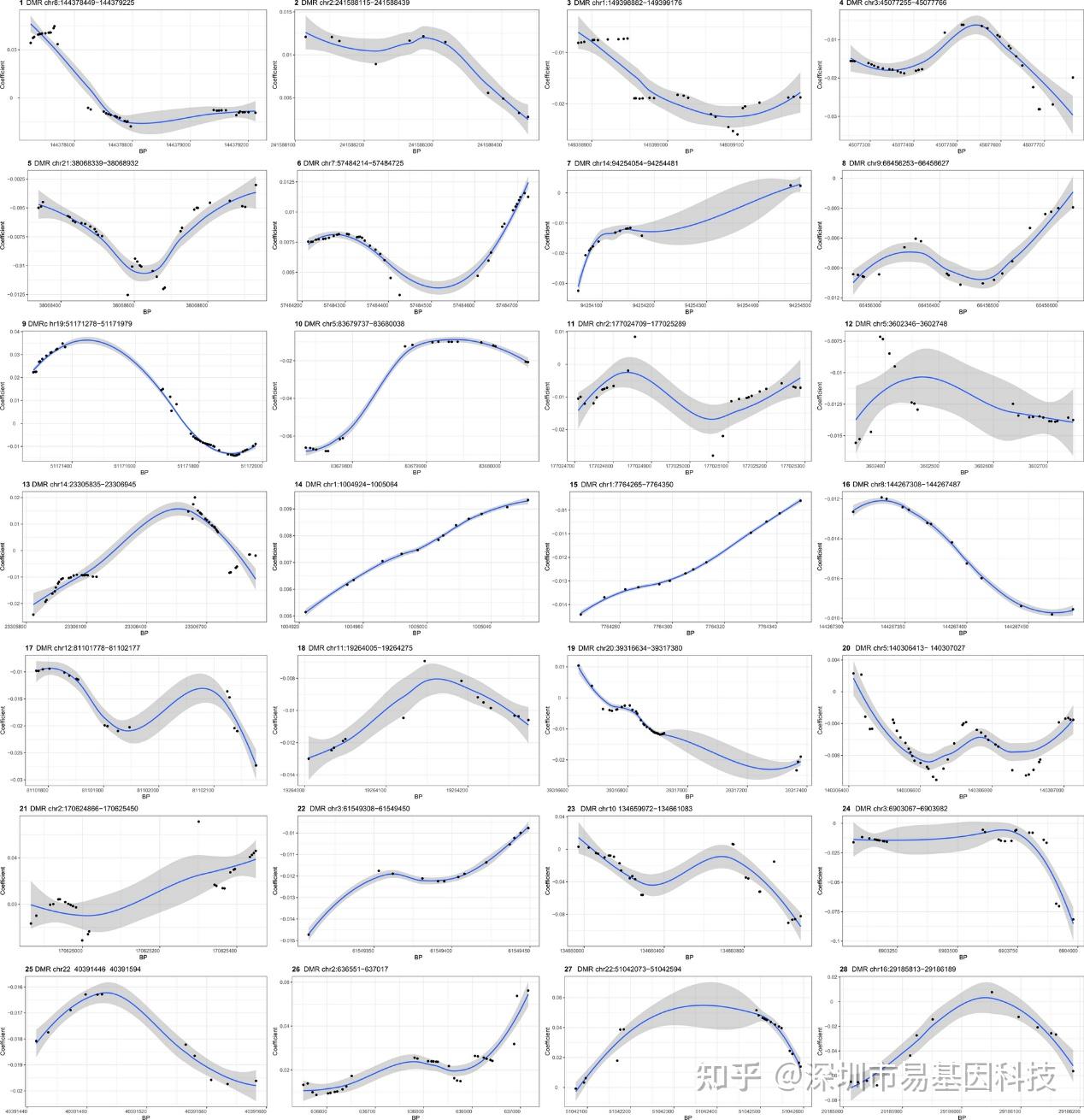 图2:所鉴定的DMRs不同甲基化模式图。Y轴表示每个CpG位点与估算eGFR的相关系数,X轴表示染色体位置。黑色点代表每个CpG位点,蓝色线条表示每个DMR的甲基化模式。BP表示碱基对,chr表示染色体。