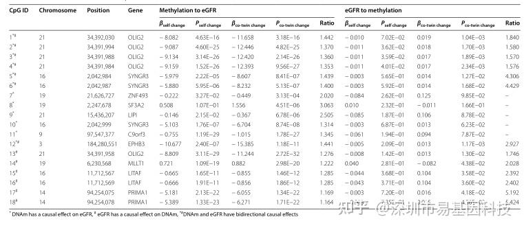 12个CpG位点(如SYNGR3和C9orf3)显示出DNAm对eGFR的因果效应;13个CpG位点(如EPHB3和MLLT1)显示出eGFR对DNAm的因果效应。