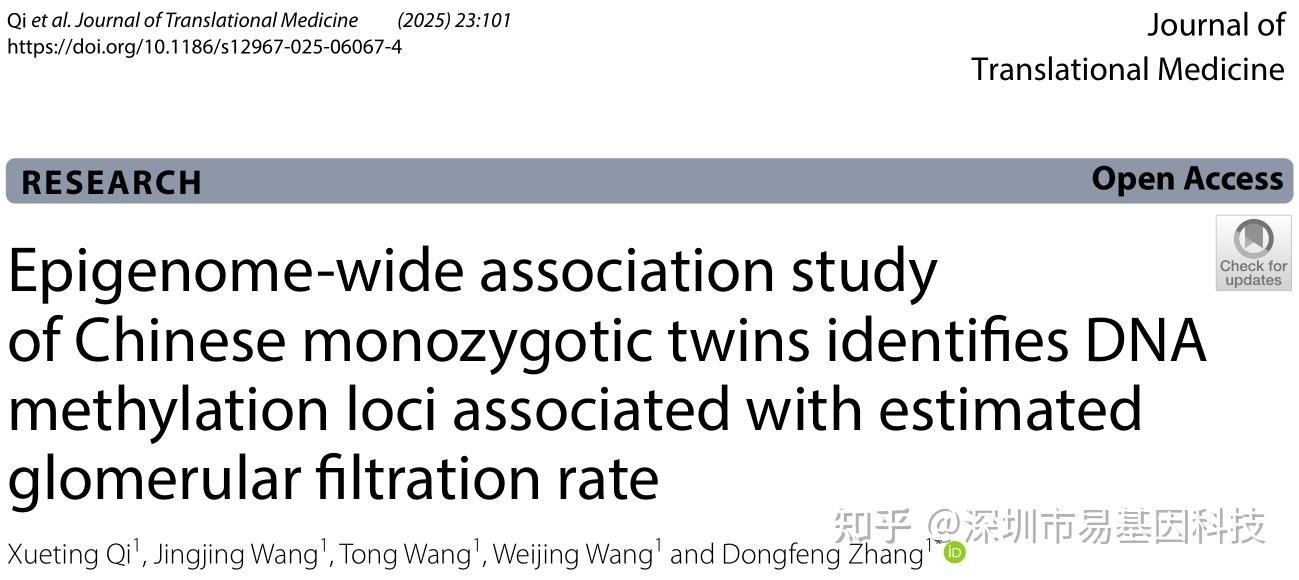 易基因:RRBS及EWAS分析揭示同卵双生子与肾小球滤过率相关的DNA甲基化位点|疾病研究