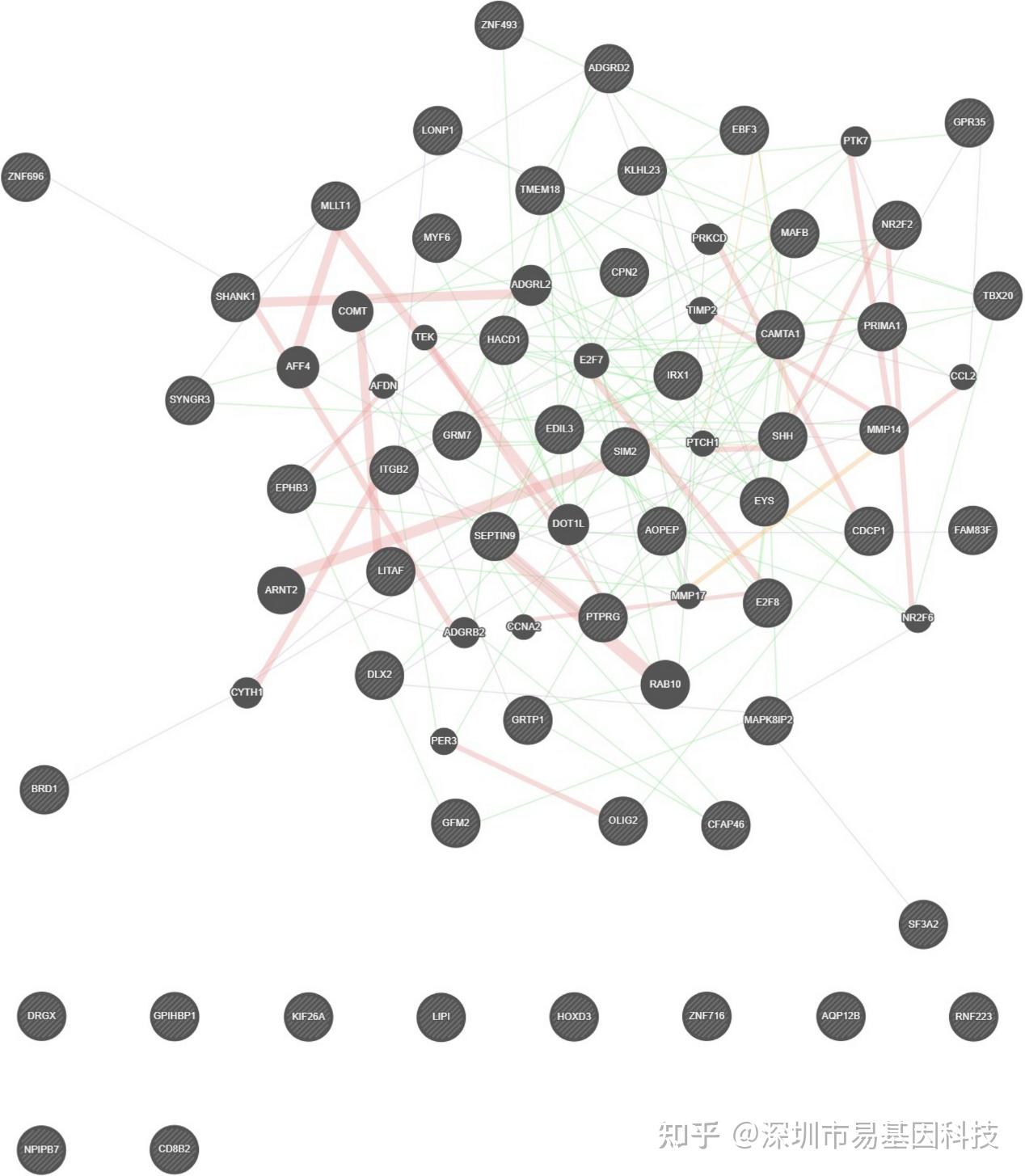 图3:基因互作网络示意图。紫色表示共表达;红色表示物理相互作用;绿色表示基因相互作用;黄色表示预测关系。