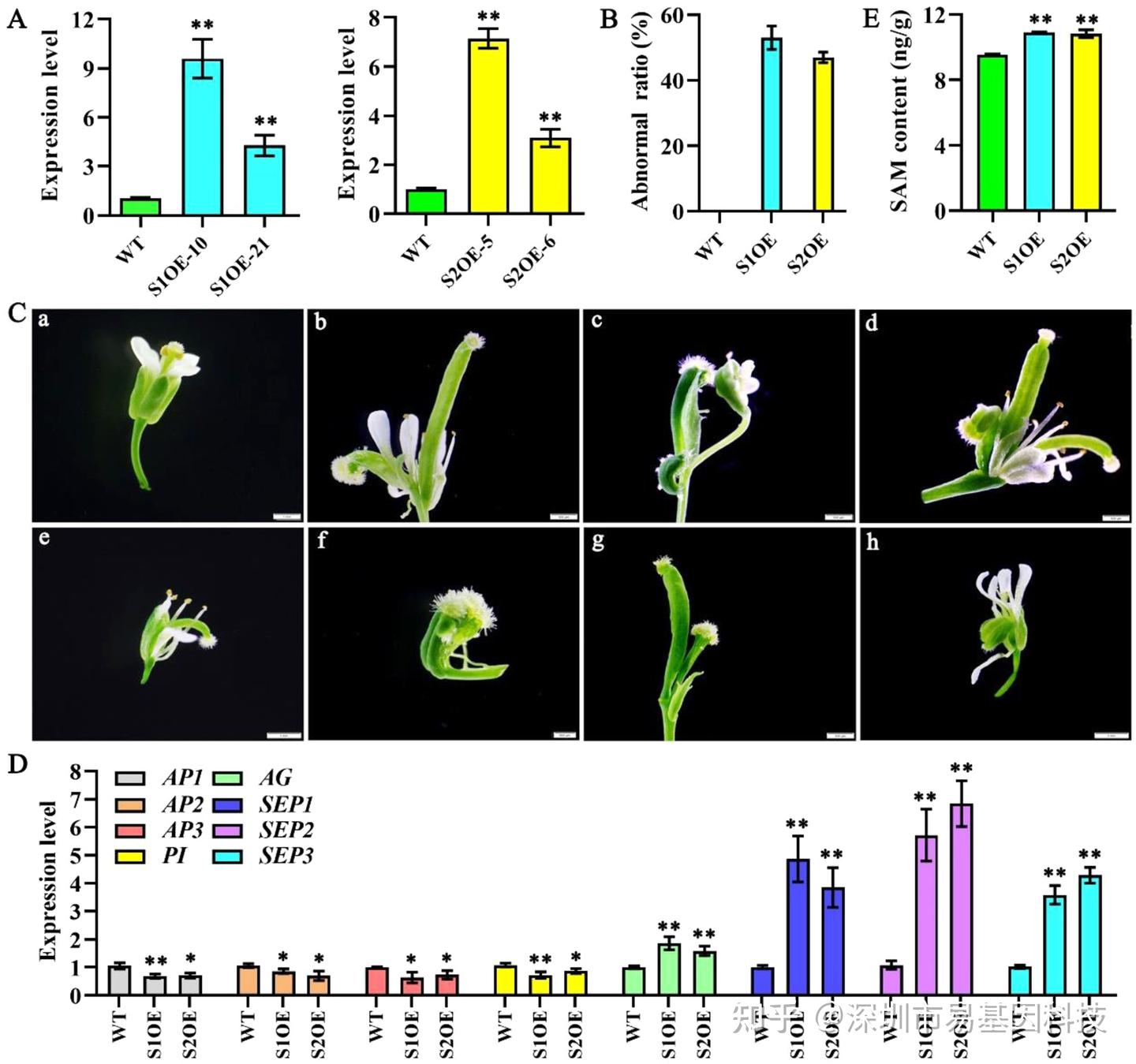 图1:拟南芥中AtSAMS过表达导致异常的花器官表型。