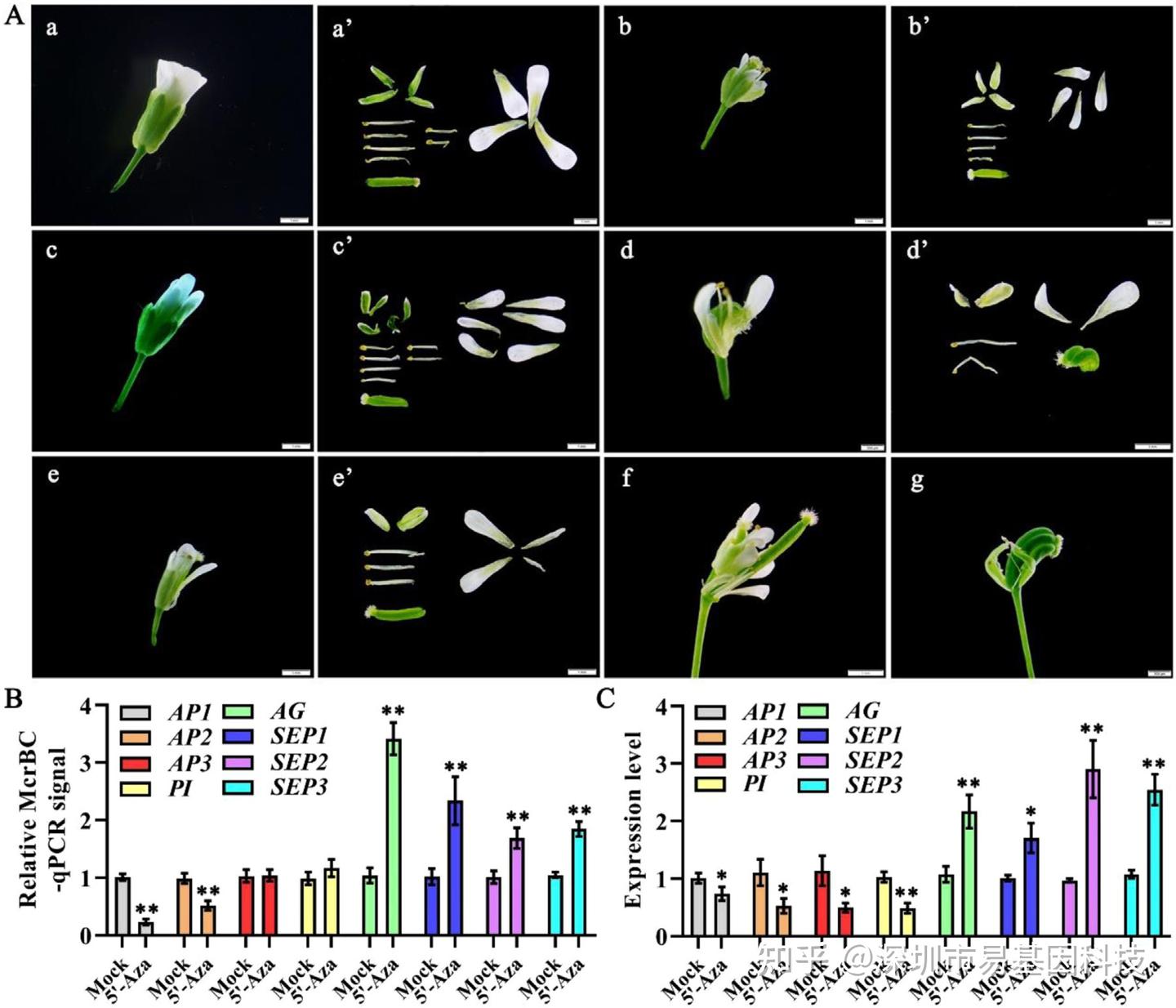(A)5′-Aza处理或模拟处理的野生型(WT)拟南芥的花器官。(a)模拟处理(Mock)。(b-g)5′-Aza处理。(a′-e′)相应的解剖结构。