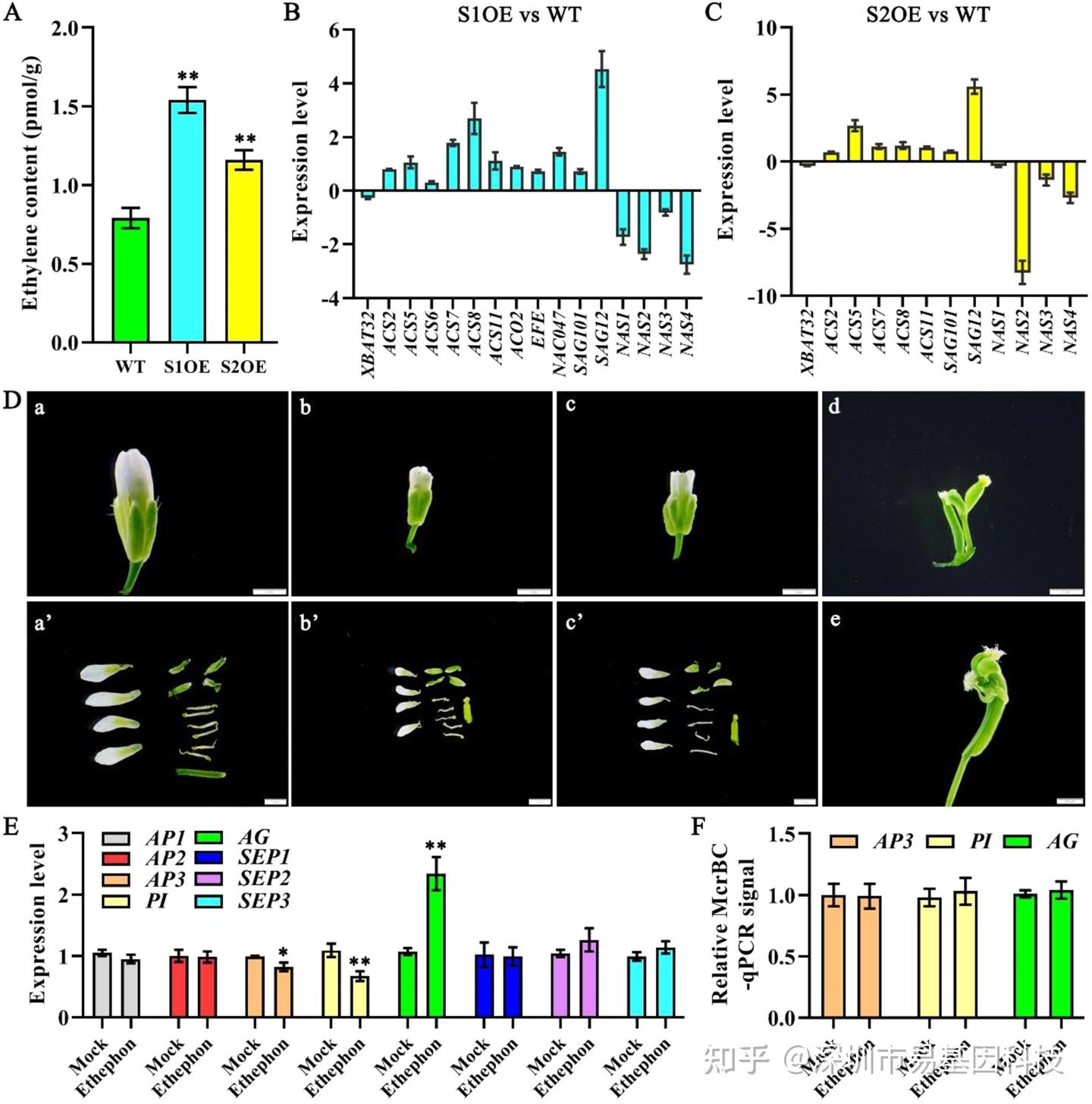 SAMOE植物的乙烯含量显著高于WT植物,而多胺和烟酰胺含量变化不大。外源乙烯处理(ethephon)的WT植物表现出与SAMOE相似的花器官异常,且B功能基因表达下调,C功能基因表达上调,但这些基因的甲基化水平未发生变化。