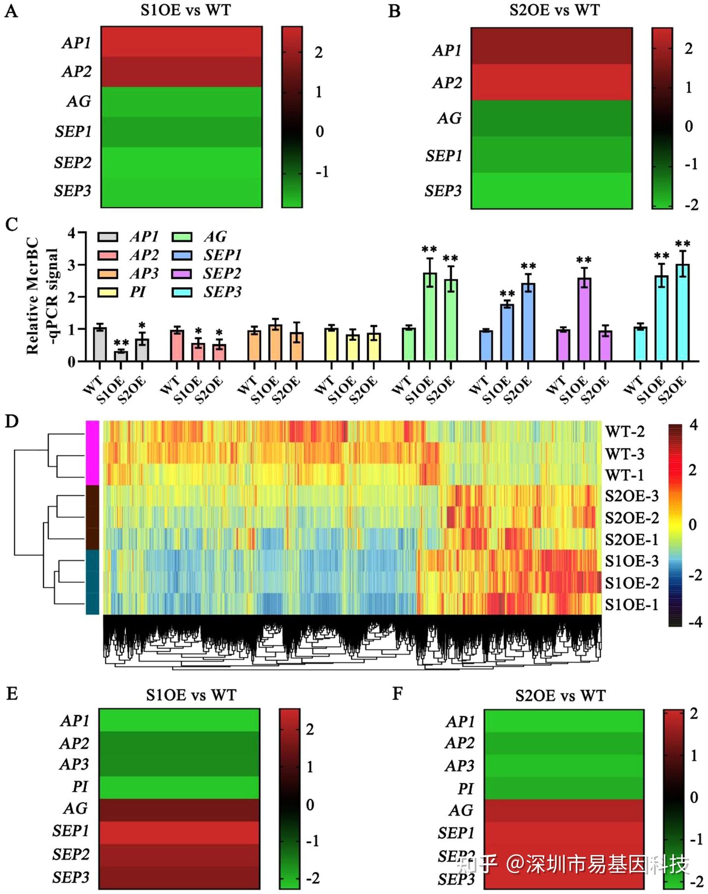 RNA-seq和qRT-PCR结果显示,SAMOE植物中A功能基因(AP1和AP2)和B功能基因(AP3和PI)表达下调,而C功能基因(AG)和E功能基因(SEP1、SEP2和SEP3)表达上调。