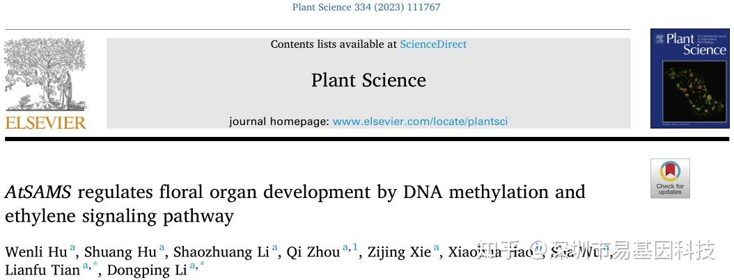 Hu W, Hu S, Li S, Zhou Q, Xie Z, Hao X, Wu S, Tian L, Li D. AtSAMS regulates floral organ development by DNA methylation and ethylene signaling pathway. Plant Sci. 2023 Sep;334:111767. pii: S0168-9452(23)00184-X. doi: 10.1016/j.plantsci.2023.111767.