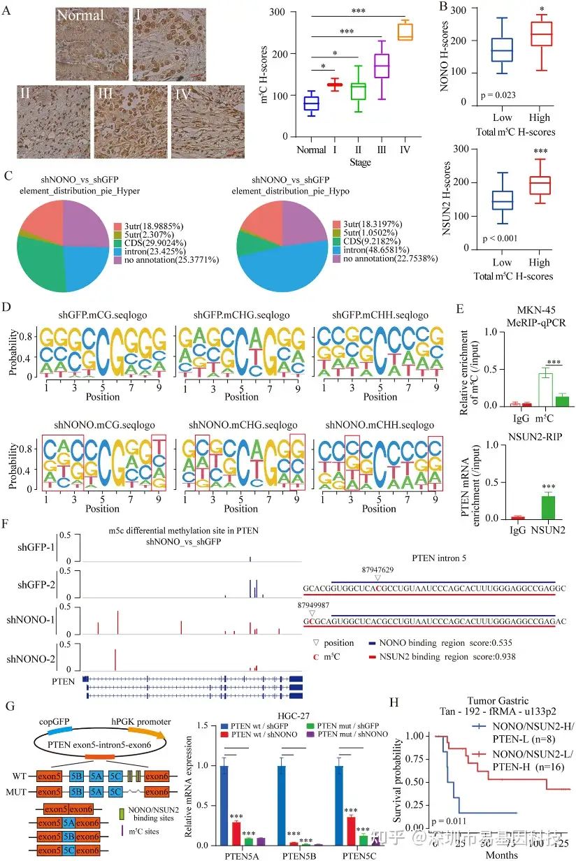 本研究揭示了NONO以m5C依赖性方式调控PTEN mRNA的可变剪切,导致胃癌中PTEN表达下调。阐明了NONO通过m5C修饰和相关可变剪切介导肿瘤抑制基因失活的新机制。