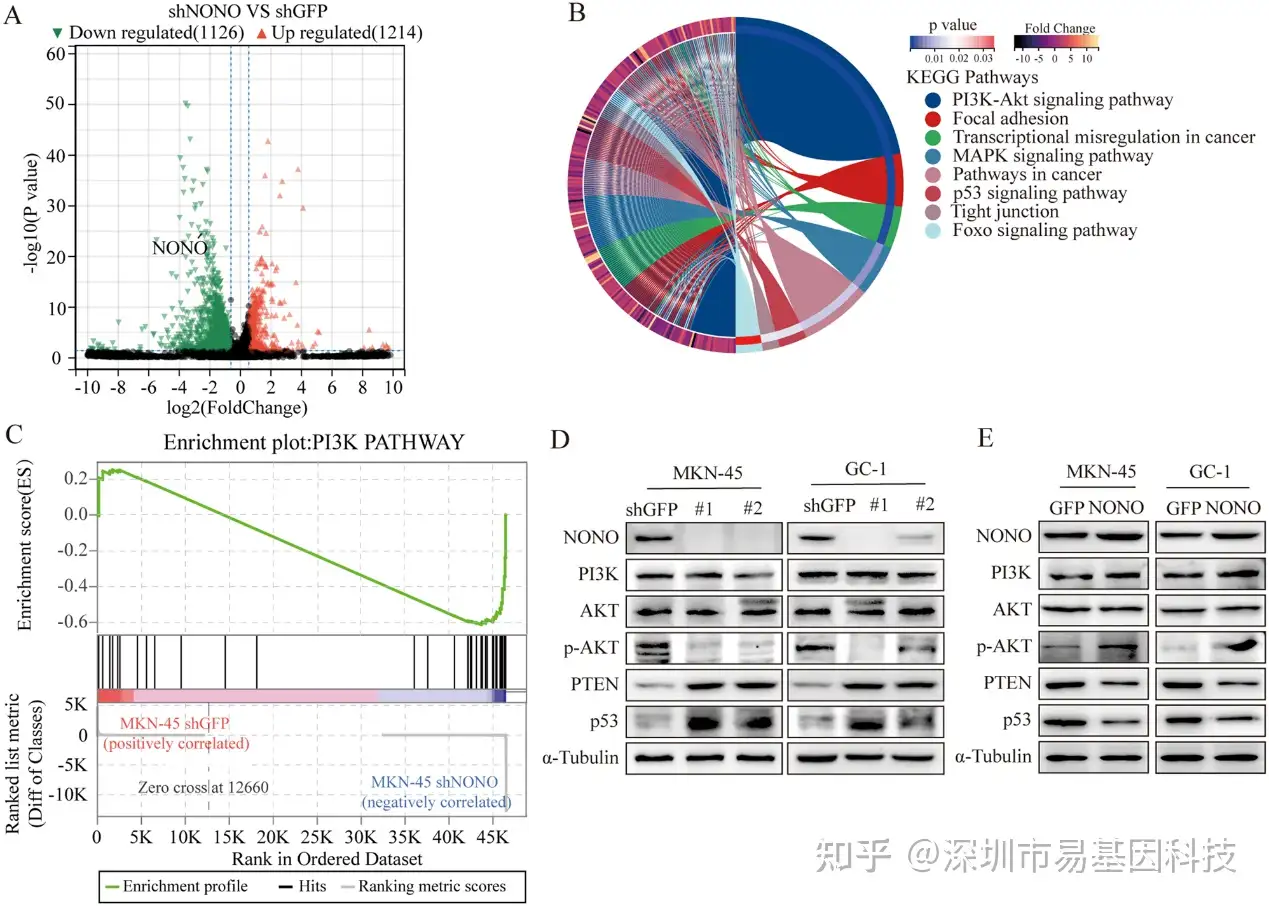图1:NONO蛋白在胃癌中作为癌基因和PI3K-AKT信号通路调控因子。