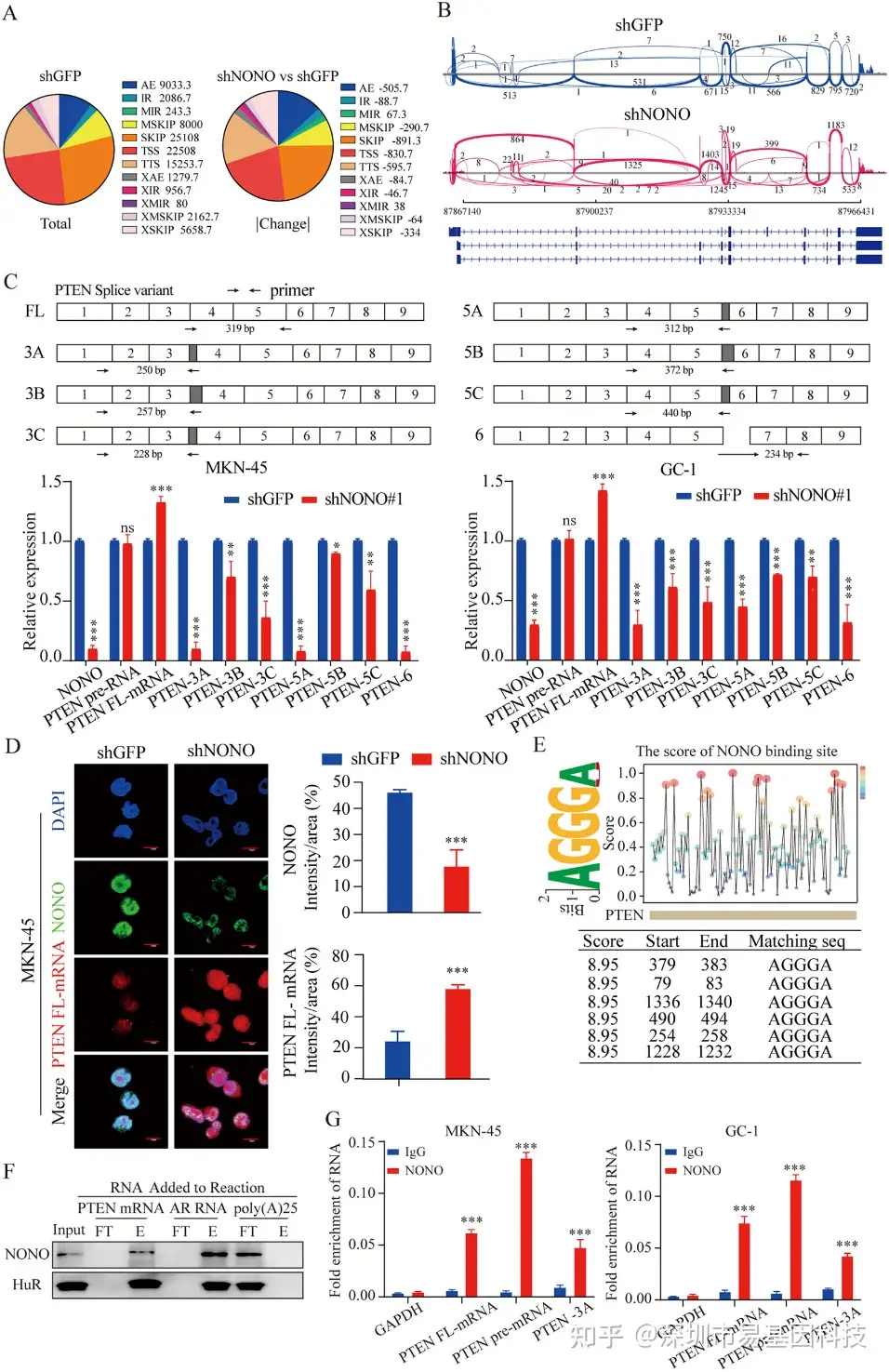 RNA-Seq分析显示,NONO敲低导致PTEN mRNA的剪切模式改变,增加了PTEN全长mRNA的表达,减少了其他剪切变体的表达。