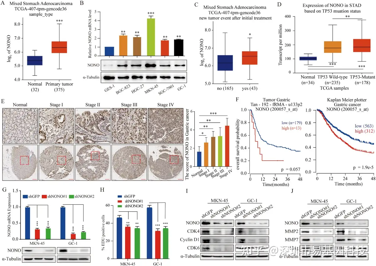 - 在TCGA数据库中,与正常胃组织(32例)相比,胃癌组织(375例)中NONO mRNA水平显著增加。