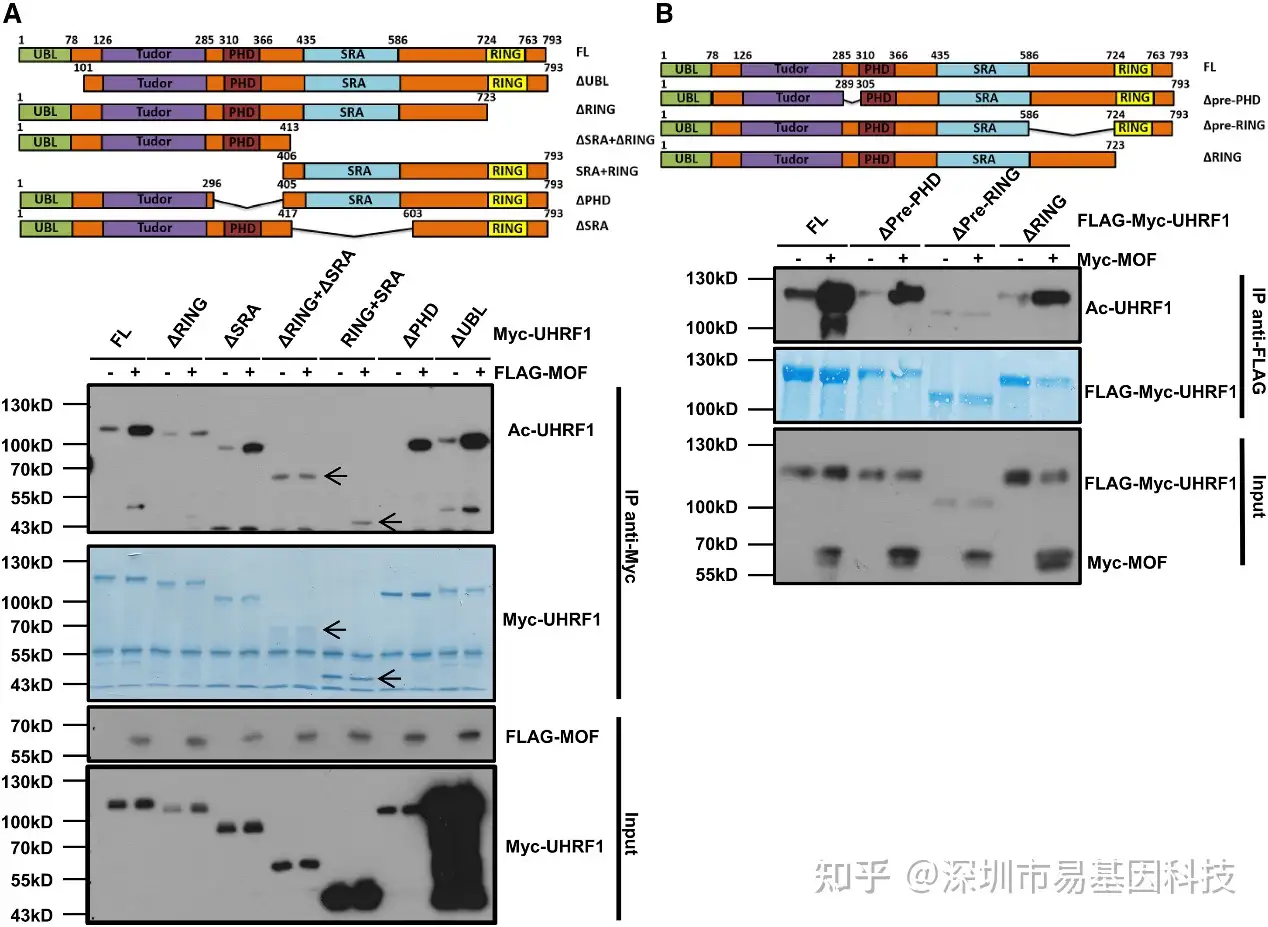 体外实验:通过体外乙酰化实验,使用纯化的GST-UHRF1和GST-MOF蛋白,验证了MOF对UHRF1的直接乙酰化作用。
