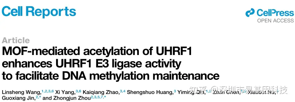 近日,广东省人民医院心血管研究所/广东省人民医院医学研究所/香港大学生物医学院王霖晟博士等为第一作者,广东省人民医院医学研究所/香港大学生物医学院/香港大学深圳医院骨科中心周中军教授、广东省人民医院医学研究所金国祥研究员为共同通讯作者,在《Cell Reports》期刊发表题为《MOF-mediated acetylation of UHRF1 enhances UHRF1 E3 ligase activity to facilitate DNA methylation maintenance》的研究论文。研究揭示了MOF(males absent on the first)对UHRF1蛋白的乙酰化修饰如何调节DNA甲基化维持过程。研究发现,MOF能够乙酰化UHRF1的K670位点,而HDAC1(histone deacetylase 1)则能够去乙酰化该位点。这种乙酰化修饰增强了UHRF1的E3泛素连接酶活性,进而促进了组蛋白H3泛素化,这对于DNMT1(DNA methyltransferase 1)的招募和DNA甲基化维持至关重要。深圳易基因在本研究中提供重要的甲基化检测(RRBS)技术服务。
