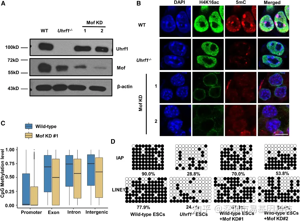 (B)对野生型、Uhrf1-/-和Mof敲低小鼠胚胎干细胞(ESCs)中的5mC水平进行免疫荧光染色。对内源性H4K16ac进行染色以反映Mof乙酰转移酶活性。